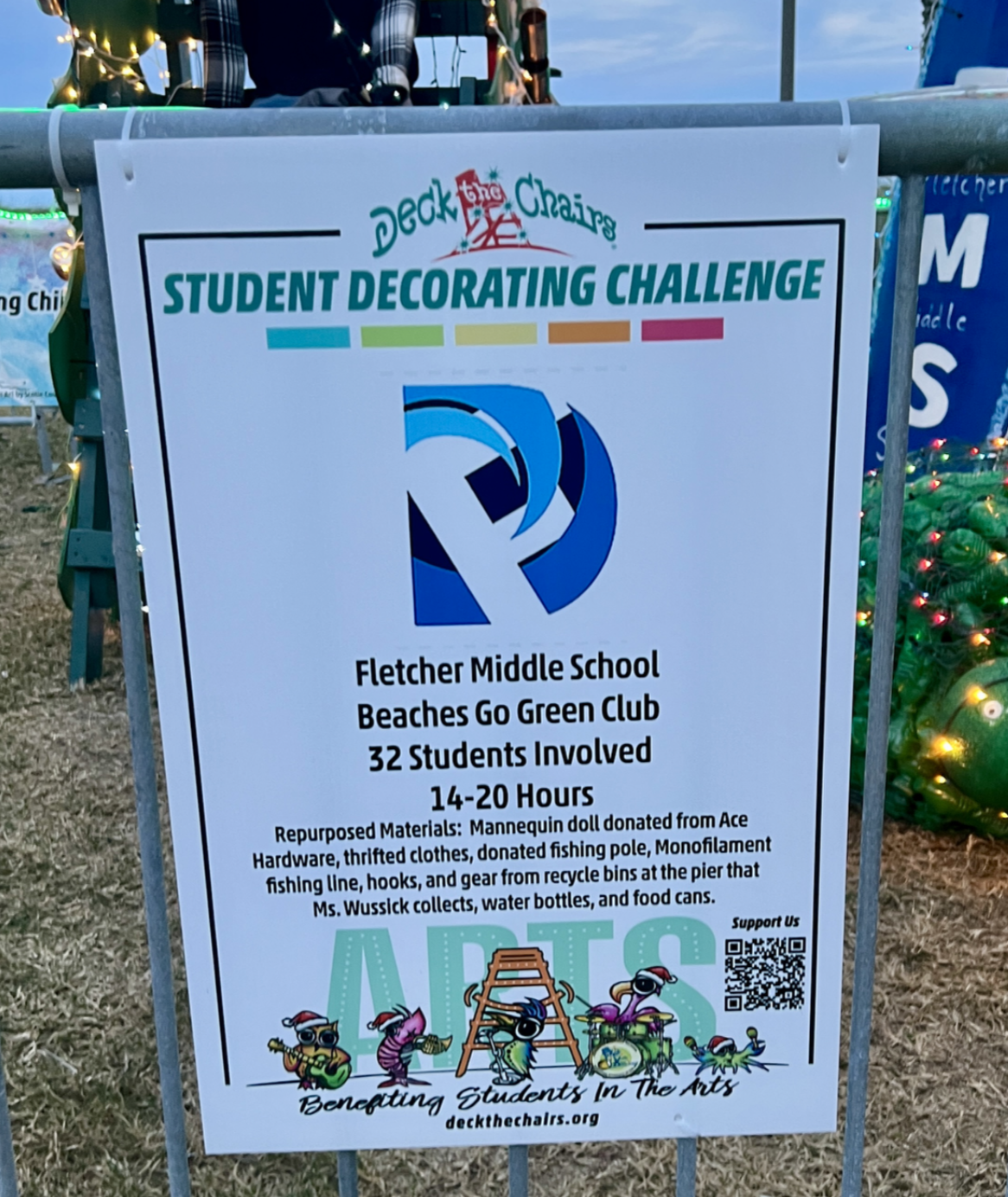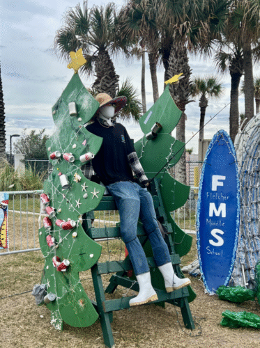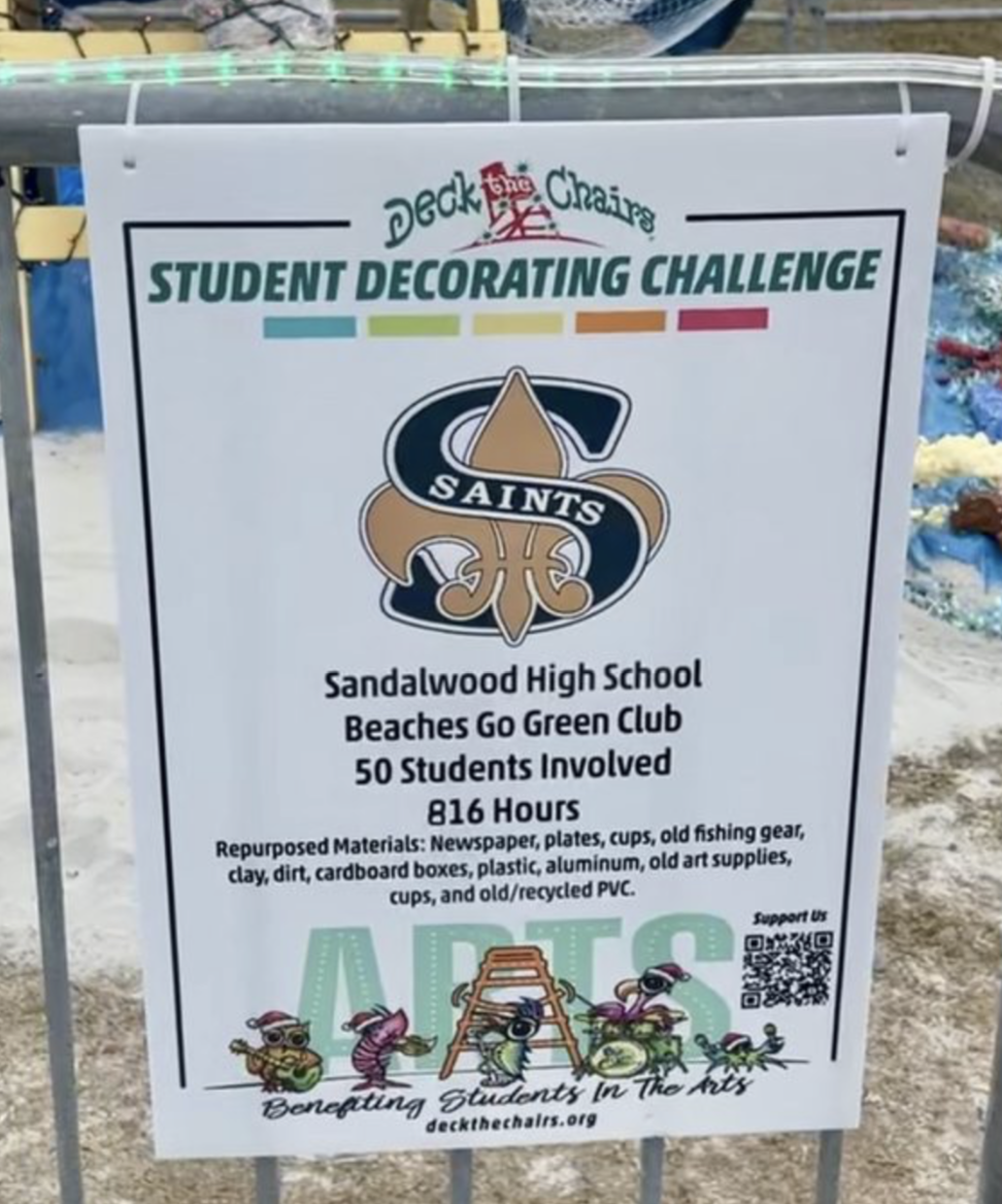 Our clubs at Fletcher Middle School and Sandalwood High worked tirelessly on their displays for Deck the Chairs 2025! Students repurposed newspaper, plates, cups, old fishing gear, cardboard boxes, plastic, aluminum, old art supplies, PVC, a mannequin doll, thrifted clothes, an old fishing pole, fishing line, hooks, and more.