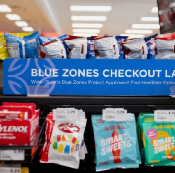 Blue Zones Project promotes healthier living practices in grocery stores & beyond. Efforts include replacing artificial candy in checkout lines with a cleaner selection, adding signage to help shoppers make healthier swaps, and promoting habits for employees & costumers that support long-term health.