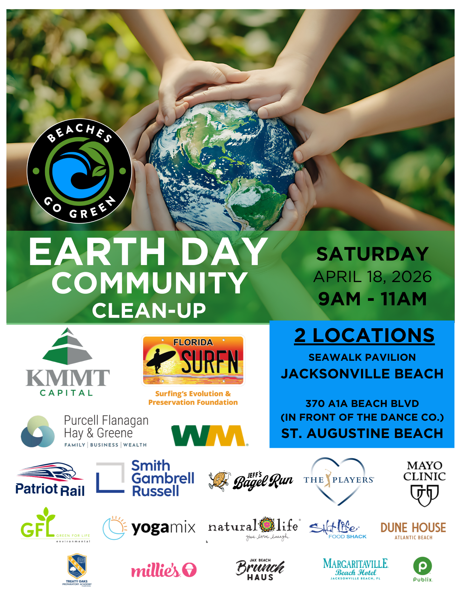 Celebrate Earth Day with us! 🌎 Join our 2-location cleanup — we’ll bring the supplies, you bring the energy! Let’s make a difference together. You can find us at Seawalk Pavilion in Jacksonville Beach & in St. Augustine Beach in front of the Dance Company! April 18, 2026. 9-11 am.