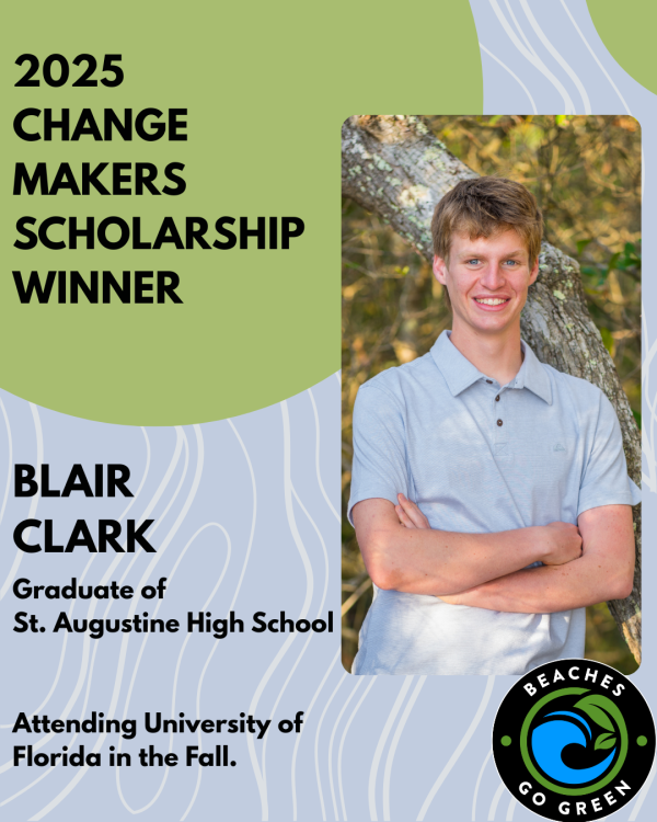 Beaches Go Green is awarding (two) $2,500 scholarships each calendar year to current high school seniors and higher education students (trade school, college, or university students) that are members of sanctioned Beaches Go Green Student clubs in Duval or St. Johns Counties. The funds will be used for continuing education. Scholarships are awarded to qualified students who have demonstrated significant commitment to preserving, improving, or providing education on environmental or wildlife conservation or sustainability issues.